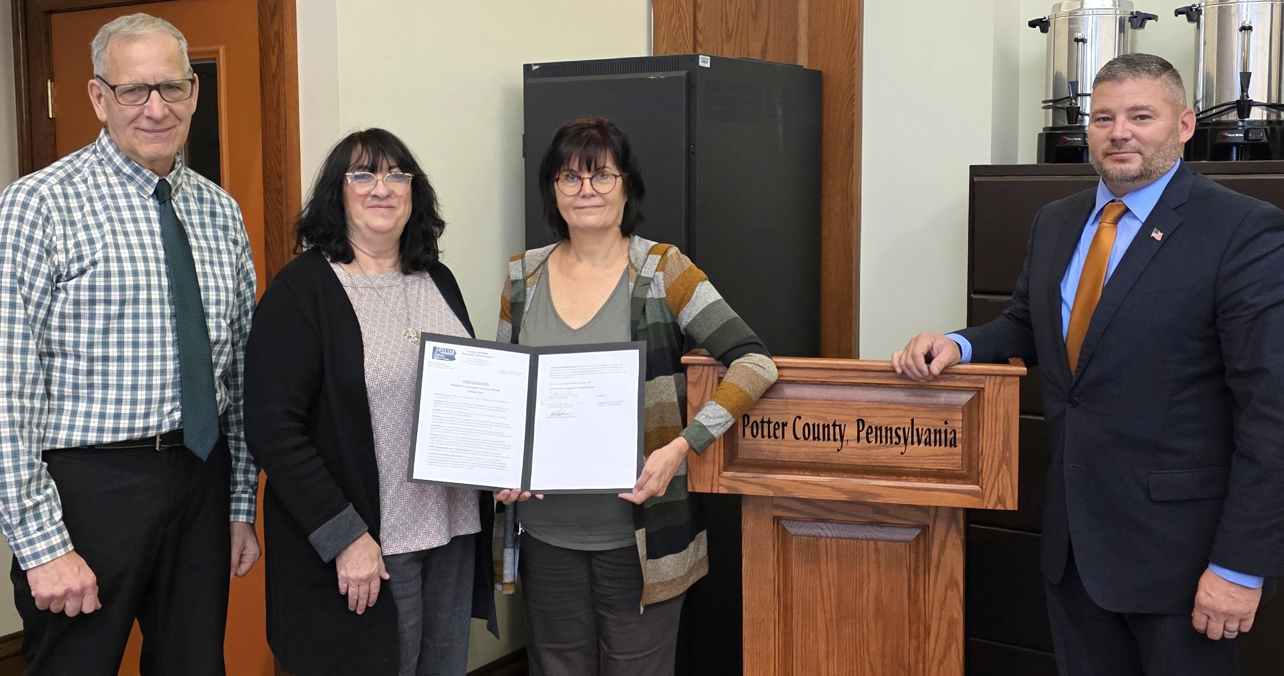 Marsha Dippold (second from left) has directed employment support services across the region for many years through Dickinson Center Inc. She accepted a copy of a Potter County proclamation recognizing October as National Disability Employment Awareness Month from Commissioners (from left) Paul Heimel, Nancy Grupp and Robert Rossman.